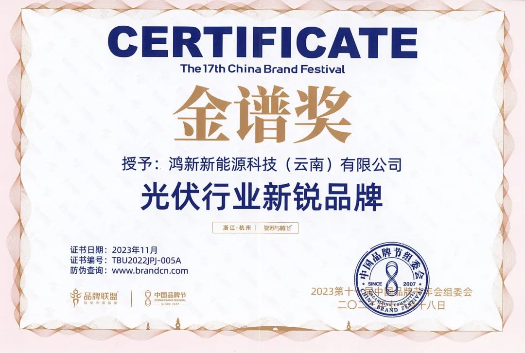 近期,中国规格最高、规模最大的年度品牌盛会——2023第十七届中国品牌节在杭州开幕,政、商、产、学、媒等6000余位各界嘉宾济济一堂,配合见证民族品牌的崛起。同期,作为推动企业高质量建设的《TopBrand 2023中国品牌节金谱奖》(以下简称“金谱奖”)盛大揭晓,优德88官网网站股份控股子公司鸿新新能源科技(云南)有限公司(以下简称鸿新新能源)荣获“金谱奖·光伏行业新锐品牌”。