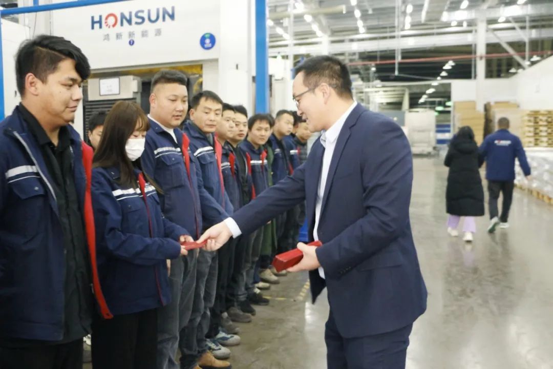 每一个斗争的身影,都是最美的景物。为了让坚守岗位的斗争者们感受到新年的喜悦和公司的温暖,鸿新新能源总司理黄涛明代表公司向导来到各个车间,向每位同事送上了节日祝福和慰问物资,让员工在公司过个清静年、暖心年。